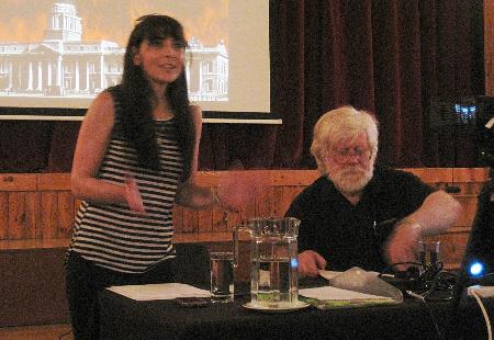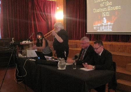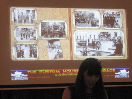 At right Liz Gillis presents the keynote paper "The Custom House Fire brigade" while, on the screen behind her, can be seen photos of previous commemorations of this attack.