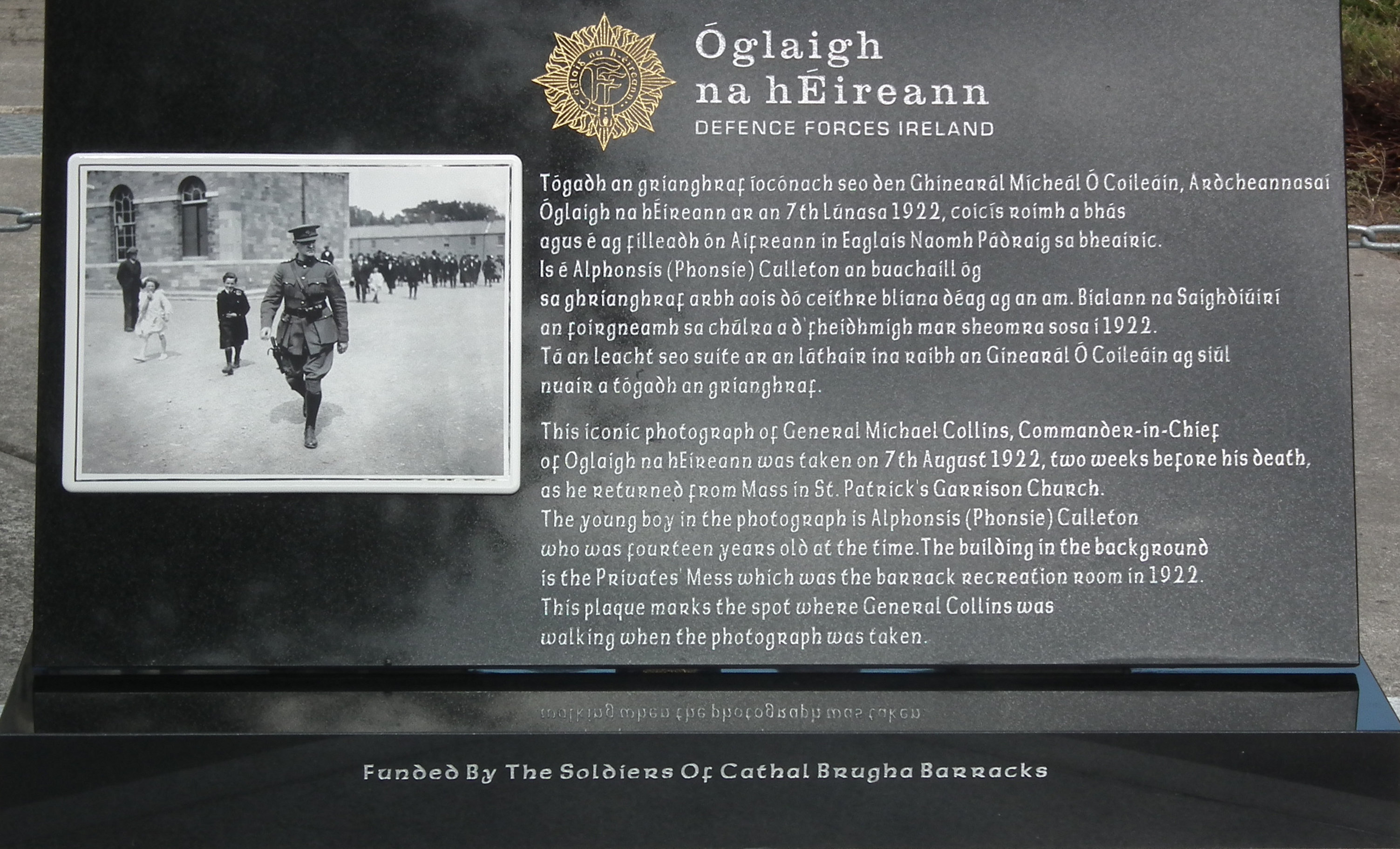 This magnificent memorial was proposed and paid for by the soldiers of Cathal Brugha Barracks, in commemoration of their first Commander in Chief. It is in black marble, and features the famous photo of Michael, taken August 7, 1922, as he strode back from the chapel where e had attended ass. In the background can be seen 14-year-old piper Alphonsis Culloten. The memorial is sited on the very spot where General Collins was walking in the photo, identified following extensive research by by the Barracks barber, Private Noel O’Donnell.