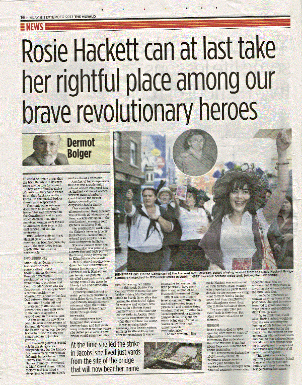 Rosie took part in the Lockout demonstration in Dublin in 1913 and this year, during the commemoration in Dublin, many of the participants carried Rosie cards in support of her (including our own Liz Gillis - see Evening Herald report at right!)